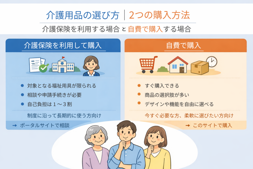 本ページでは、介護保険を利用して購入する方法と、自費で購入する方法(当ショップでの購入)の違いを分かりやすく整理します。